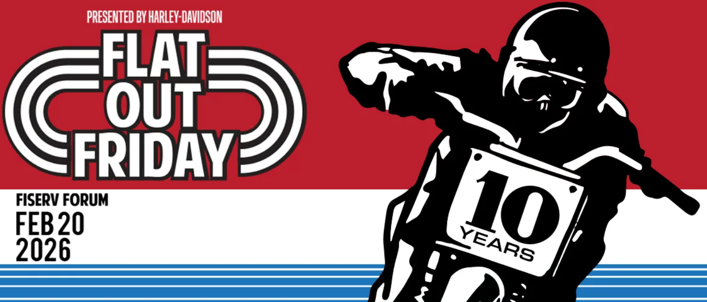 Flat Out Friday, presented by Harley-Davidson Motorcycle Company, returns to Fiserv Forum on Friday, Feb. 20, for its 10-year anniversary celebration. Riders from the ages of six to 79 years old come from across the country to compete at the largest and most distinguished indoor flat track race in the United States.